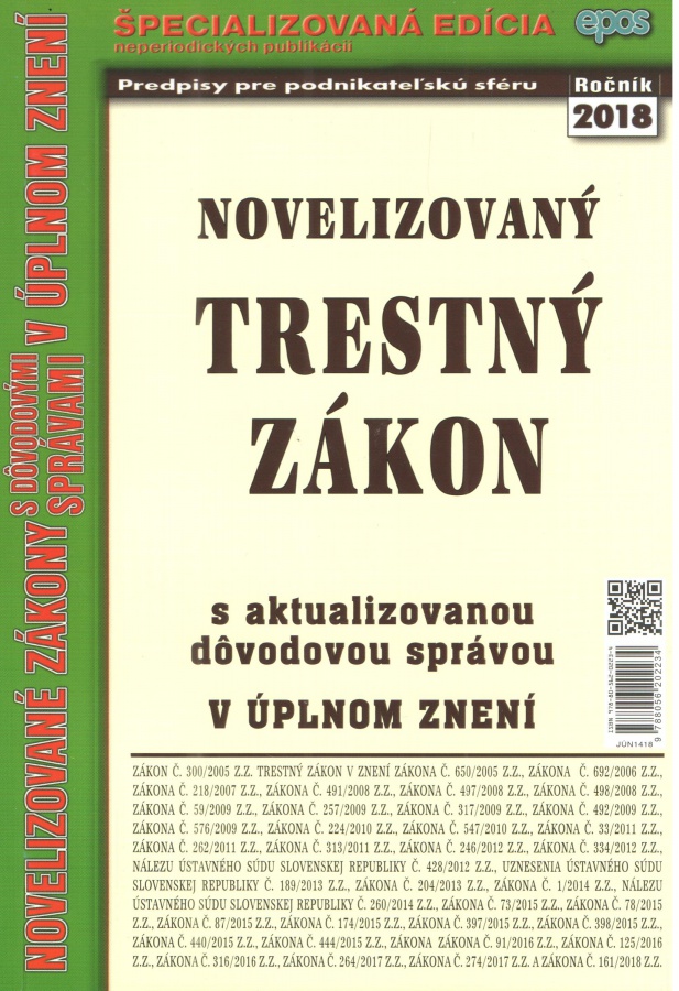 Zákon č. 300/2005 Z.z. Trestný zákon v znení zákona č. 650/2005 Z.z., zákona č. 692/2006 Z.z., zákona č. 218/2007 Z.z., zákona č. 491/2008 Z.z., zákona č. 497/2008 Z.z., zákona č. 498/2008 Z.z., zákona č. 59/2009 Z.z., zákona č. 257/2009 Z.z., zákona č. 317/2009 Z.z., zákona č. 492/2009 Z.z., zákona č. 576/2009 Z.z., zákona č. 224/2010 Z.z., zákona č. 547/2010 Z.z., zákona č. 33/2011 Z.z., zákona č. 262/2011 Z.z., zákona č. 313/2011 Z.z., zákona č. 246/2012 Z.z., zákona č. 334/2012 Z.z., nálezu Ústavného súdu Slovenskej republiky č. 428/2012 Z.z., uznesenia Ústavného súdu Slovenskej republiky č. 189/2013 Z.z., zákona č. 204/2013 Z.z., zákona č. 1/2014 Z.z., nálezu Ústavného súdu Slovenskej republiky č. 260/2014 Z.z., zákona č. 73/2015 Z.z., zákona č. 78/2015 Z.z., zákona č. 87/2015 Z.z., zákona č. 174/2015 Z.z., zákona č. 397/2015 Z.z., zákona č. 398/2015 Z.z., zákona č. 440/2015 Z.z., zákona č. 444/2015 Z.z., zákona zákona č. 91/2016 Z.z., zákona č. 125/2016 Z.z., zákona č. 316/2016 Z.z., zákona č. 264/2017 Z.z., zákona č. 274/2017 z.z. a zákona č. 161/2018 z.z.